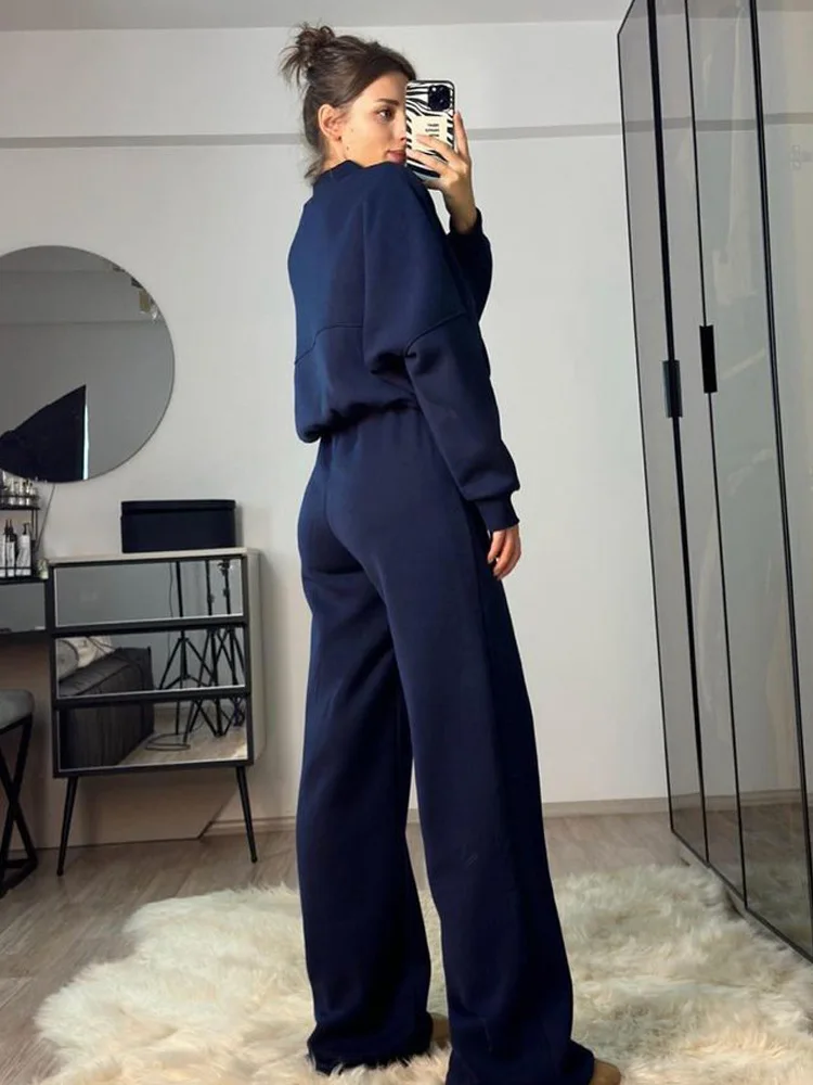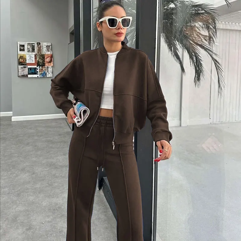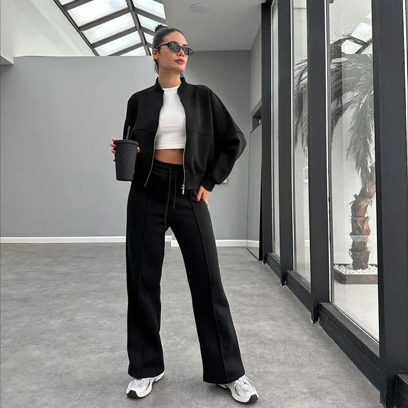FSMG Casual Sweatshirt Pants Set Solid Zippers Jackets Loose High Waist Lace-up Elastic Waist Trousers Suits Sportswear 2 Pieces